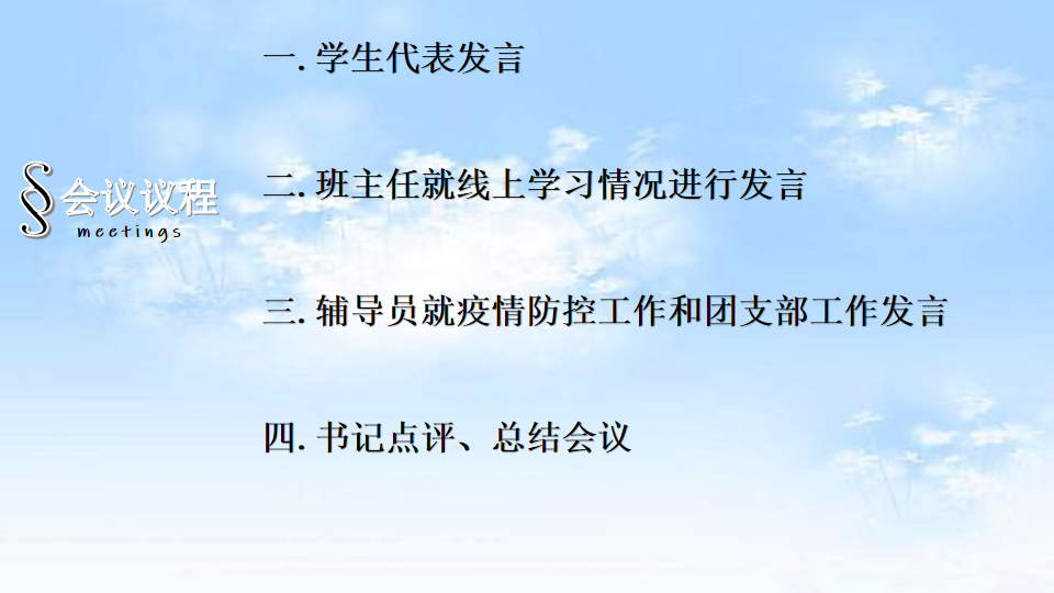 本次班会由班长许可主持,首先由6位学生代表发言,他们汇报了个人近期线上学习的情况,并以爱国主义,珍惜生命、敬畏自然、爱与感恩和心理健康等主题进行了交流。随后,三名班委对读完“习近平总书记给北大援鄂医‘90后’党员重要回信”的感受进行了分享,表示会牢记总书记对青年人的嘱托,争做优秀的当代大学生 。