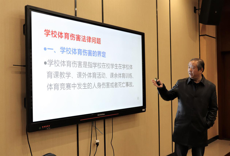 讲座伊始,汤教授从体育对我国青少年体质健康的重要性出发,提出“为什么中国学生的体质越来越差?”问题并阐释了问题产生的原因,引出我国要重视国民体育发展,增强人民体质。汤教授告诫同学们在进行体育教学时,要注意体育设施是否完善,是否能够保障学生人身安全。汤教授就学校体育过程中会出现的伤害问题从法律的角度向老师和同学们进行阐释。他指出,在体育运动的过程中会不可避免地出现安全性的问题,涉及体育法学的知识,并通过案例向同学们解析了学校体育相关的伤害问题与最终判定结果及依据。