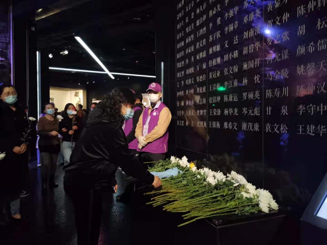 在祭坛处,老师与学生们井然有序地将自己手中的白菊摆在台上,并深深地鞠躬以表达对死难者的敬重与哀悼。