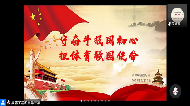 今年是建国七十二周年。为了加强大学生爱国主义教育,培养体育学子体育担当责任,2021年9月30日晚8点,taptap竞彩足球于线上开展以“守奋斗报国初心,担体育强国使命”为主题的团日活动。参与本次活动的有taptap竞彩足球团总支负责人赵伟健,taptap竞彩足球辅导员屈文文,以及taptap竞彩足球全体学生。活动由taptap竞彩足球1901班包涵硕主持。