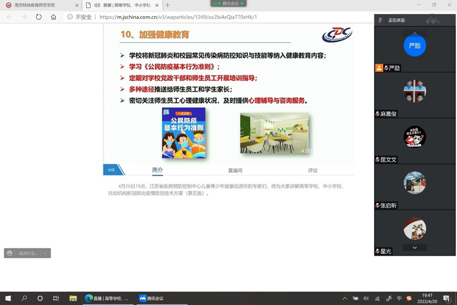 培训会由江苏省疾病预防控制中心儿童青少年健康促进所的专家们,为大家讲解高等学校、中小学校、托幼机构新冠肺炎疫情防控技术方案(第五版)。高等学校新冠肺炎疫情防控技术方案(第五版)增加了校园常态化监测预警,细化了疫情出现后的应急处置措施,对开学返校准备、在校管理、疫情监控与应急处置方面做了全方位指导。培训会后,taptap竞彩足球直属党支部书记张启昕提出,要重视本次培训内容,以高度的责任感抓细抓实学院各项疫情防控措施,做好疫情防控常态化工作,筑牢疫情防控坚固防线,一起努力做好校园疫情防控工作。