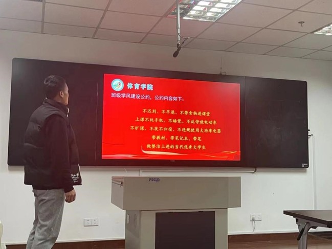 会上,屈老师结合前期体院学风建设调研结果,梳理了学风建设中存在的问题。她还以《学生手册》中汇编的规章制度为主要内容,传达了学校职能部门近期就学风建设、学生宿舍卫生专项检查、学校车辆与交通秩序管理等方面下发的相关通知文件,强化学生对规章制度学习的认知与教育,同时引导学生树立规则意识,提高用规章制度约束自己行为的自觉性。班会上,同学们还积极通过了《学风建设班级公约》,组建了由班级干部、学生党员、入党积极分子为主体的学风建设督查队伍。