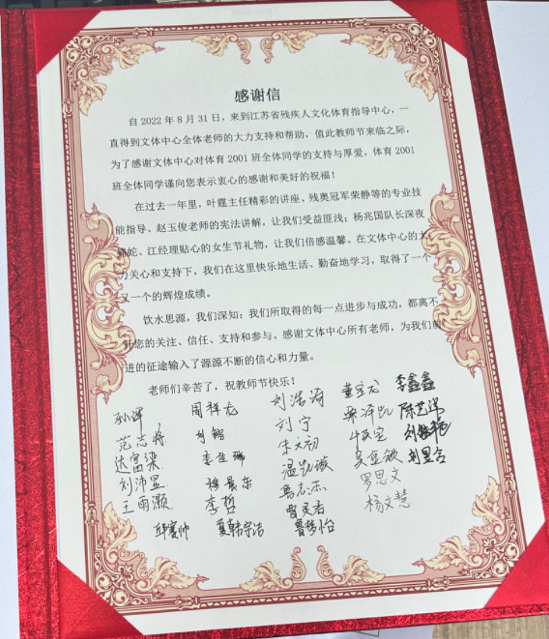 随后,在全国第39个教师节之际,taptap竞彩足球浦口校区学生代表宣读了感谢信,表达了对过去一年,文体中心所有老师给予的关注、信任、支持。学生代表向文体中心赠送纪念品表达感恩之情。