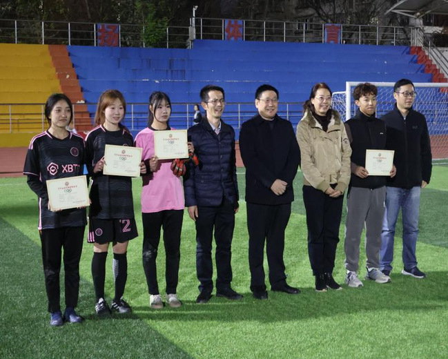 绿茵点亮梦想,激情挥洒青春。12月6日下午,“特师杯”第八届大学生女子足球比赛闭幕式暨颁奖仪式在taptap田径场举行。校党委常委、副校长、校体育运动委员会主任陈克军,taptap竞彩足球主持工作副院长金梅、直属党支部副书记谢军,学工处副处长蔡锦与获奖团队、学生代表共同参加了本次闭幕式。