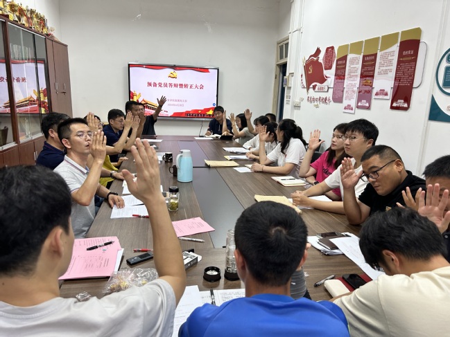 答辩通过后召开党员转正大会,讨论研究张俊天同志梁一端同志预备期满转正事宜。张俊天、梁一端两位同志向组织汇报预备期一年来的个人表现,入党介绍人对两位同志的工作情况发表了看法。通过无记名投票,与会正式党员一致同意张俊天同志和梁一端同志按期转正。谢军副书记宣读了支部决议。两位转正党员同志向大会作了表态发言。