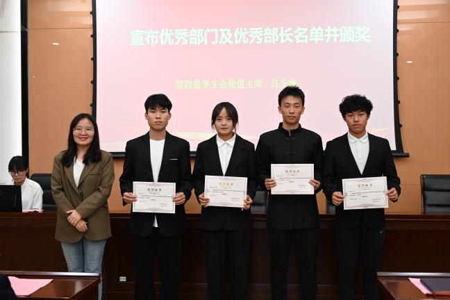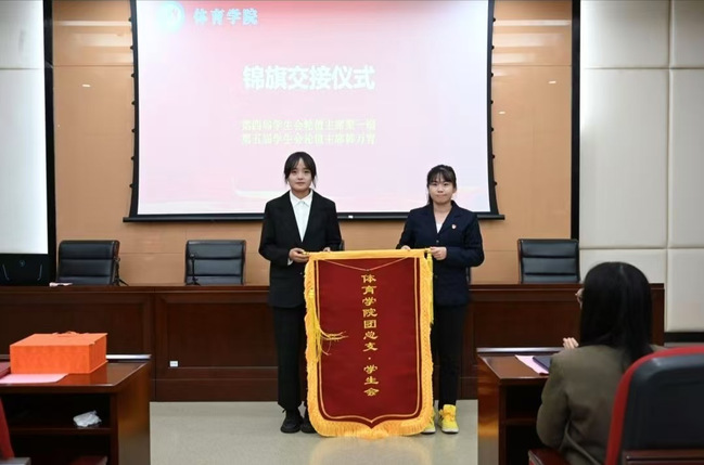 第四届学生会轮值主席王腾公布了新一届主席团和学生会部门负责人名单。上一届学生会轮值主席梁一端与新一届学生会轮值主席韩万青进行锦旗交接仪式。