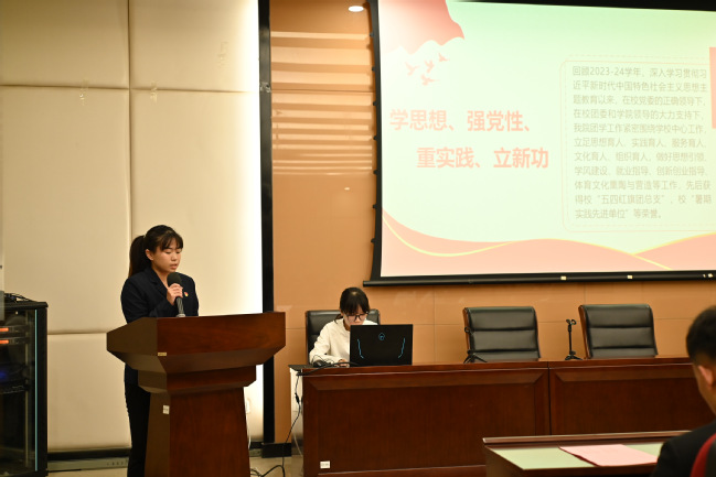 雄壮的国歌声拉开了大会的序幕。会上,第四届学生会轮值主席梁一端在大会上作了上一年度学生会工作总结。她回顾了过去一年taptap竞彩足球学生会在思想育人、实践育人、服务育人、文化育人、组织育人,做好思想引领、学风建设、就业指导、创新创业指导、体育文化熏陶与营造等方面所取得的成绩,并对学生会工作提出了未来展望。