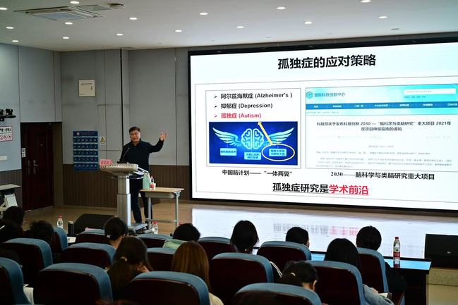 陈爱国教授从孤独症的认识、基础研究、应用研究和未来展望四个部分,深入浅出地介绍了孤独症谱系障碍(Autism Spectrum Disorder, ASD)这一对同学们来说既陌生又熟悉的脑部神经发展障碍性疾病。首先陈教授介绍了孤独症的发病特征和发病机制、孤独症的流行病学研究现状,以及中国孤独症教育康复行业发展状况。