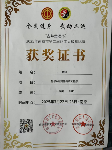 经过激烈角逐,伊晓老师凭借精湛的陈式太极拳技艺,荣获男子A组其他传统太极拳一等奖,为taptap争得了荣誉。此外,taptap代表队在集体工间操项目中表现优异,荣获二等奖,并凭借在太极拳普及推广中的突出贡献,被授予“太极拳普及贡献奖”。