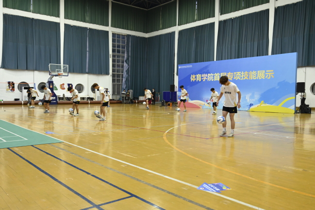 足球展示融颠球、传球和垫球于一体,展现了同学们在足球运动中扎实的基本功和团队协作能力;田径专项的同学们则通过专项体能激活操和跨栏跑,展现了他们在专项训练中核心控制能力及动作延展性与协调性;花样跳绳团队以单摇、双摇、多人交互跳等技巧,将跳绳玩出“空中芭蕾”的视觉效果;排球队员的精准垫传、大力扣杀,排舞队员的活力与韵律,无不展现扎实的专业功底。