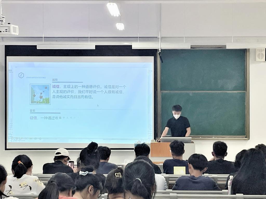 会上,李金湧阐述了诚信和征信的区别,让学生对征信的定义有了更加清晰的认识和了解,他还播放了被列为失信人员的后果和失信的惩罚等相关教育视频,让学生认识到了征信的重要性,同时告诫学生要保持信用,不能失信。他通过讲解中国个人征信系统的定义和国家相关文件规定,让同学们更加深入地认识征信的重要性。