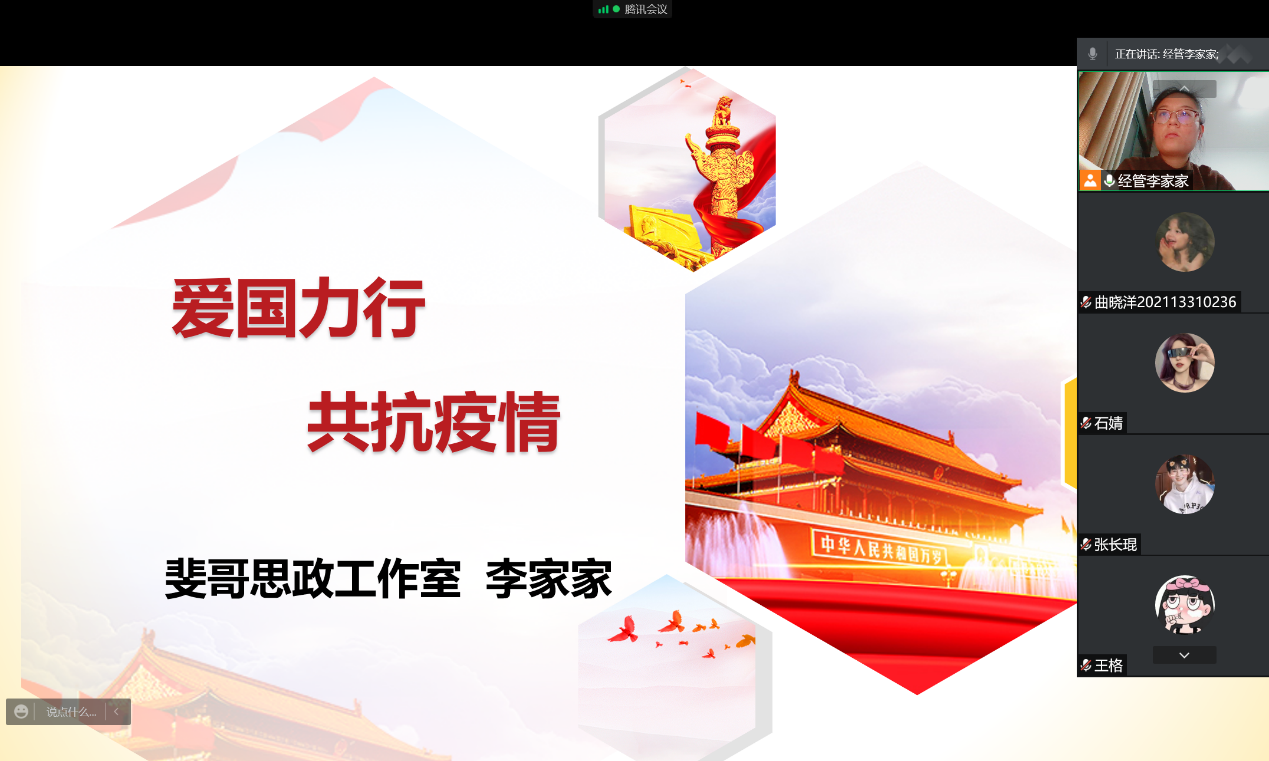 为弘扬抗疫精神,凝聚奋进力量,10月22日,beat365中文官方网站以腾讯会议直播的形式召开“爱国力行,共抗疫情”主题教育讲座,讲座由beat365官网辅导员、斐哥思政工作室成员李家家主持,部分毕业生参加。