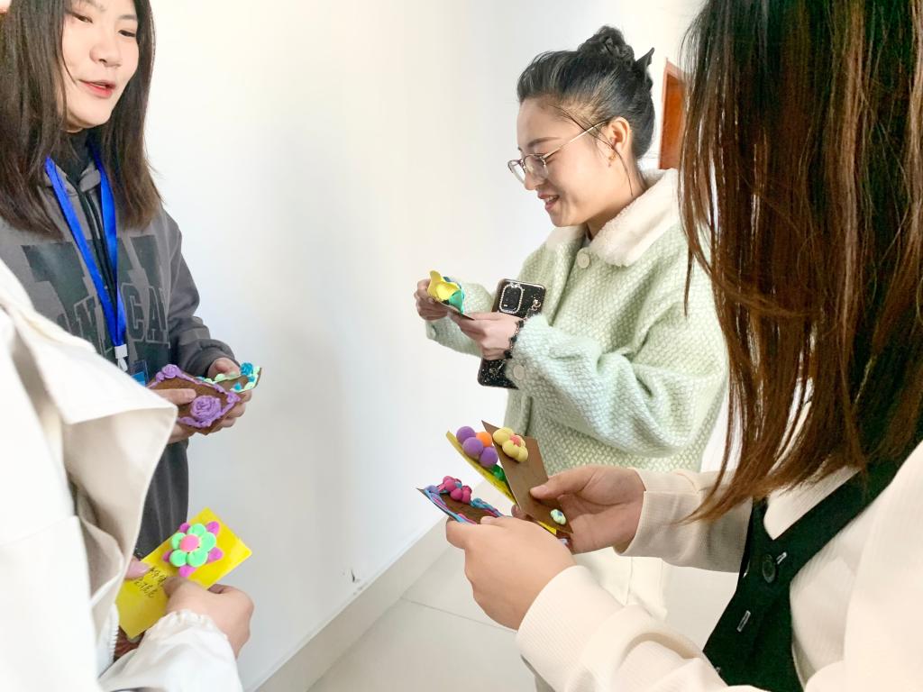 学生们为beat365官网女教师献上了亲手制作的明信片,“祝你优雅如菊花,天天乐开花”“愿一切美好如约而至,愿您青春永驻,女神节快乐”明信片上各式各样的祝福语,表达着对老师的美好祝愿。每张明信片上都点缀着学生亲手制作的纸花,象征着我们对老师教诲之恩的感激之情,寓意着老师如花朵一样芳香不散,感染他人。在一片欢声笑语中,老师收下了学生们献上的礼物,真切地感受到了学生真挚的祝福和爱戴,现场氛围其乐融融,气氛融洽。