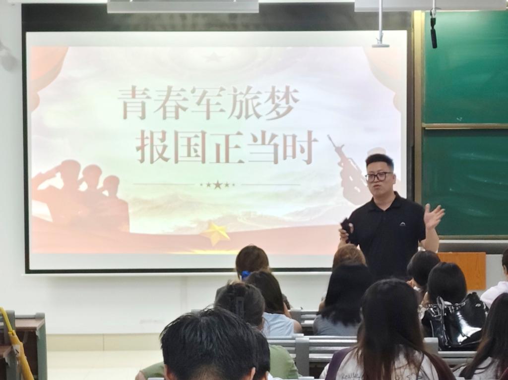 活动伊始,殷凯结合国际形势与国家发展需求,阐述了大学生参军入伍对个人成长和国防建设的重大意义,鼓励同学们将个人理想融入强军实践,用热血青春书写报国华章。随后,他详细给学生介绍了大学生入伍在学费补偿、升学深造、就业安置等方面的利好政策,并通过数据对比、案例分析,让同学们对参军入伍有了更清晰、全面的认识。