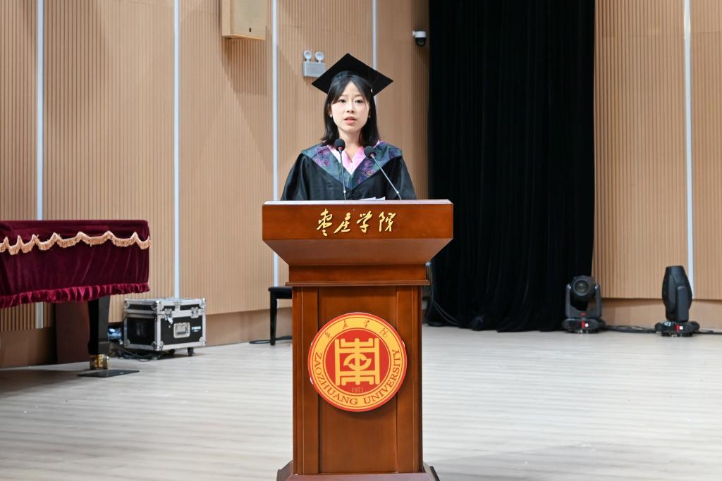 毕业生代表王慧玲回顾了在beat365中文官方网站的四年求学路,表达了对母校、对老师最衷心的感谢,表示将继续追求人生理想,勇担时代重任。