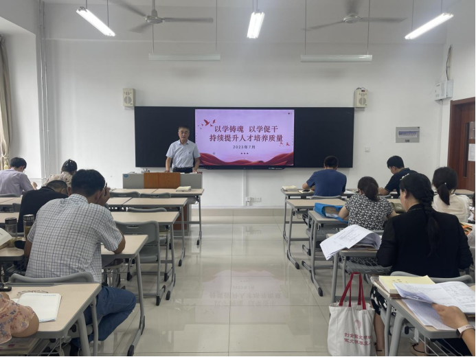 为深入开展学习贯彻习近平新时代中国特色社会主义思想主题教育,坚定办好人民满意的高等教育,7月13日,beat365中文官方网站党总支副书记、院长刘振宇以《以学铸魂以学促干持续提升人才培养质量》为题讲授主题教育专题党课,经管学院全体教职工参加。