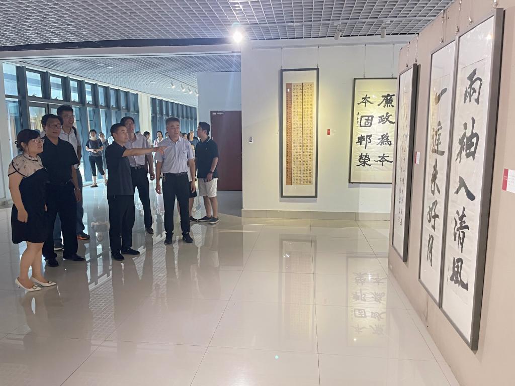 在美术与艺术设计学院副院长赵平的带领和讲解下,大家认真聆听了每幅作品创作背景和意义的讲解。参展作品主题鲜明、立意深远,集政治性、思想性、教育性、艺术性于一体,用以画说廉、以字言理、以图明纪等通俗易懂的艺术形式,在笔墨点染、光彩留影间,充分展示了廉洁文化建设的生动实践。