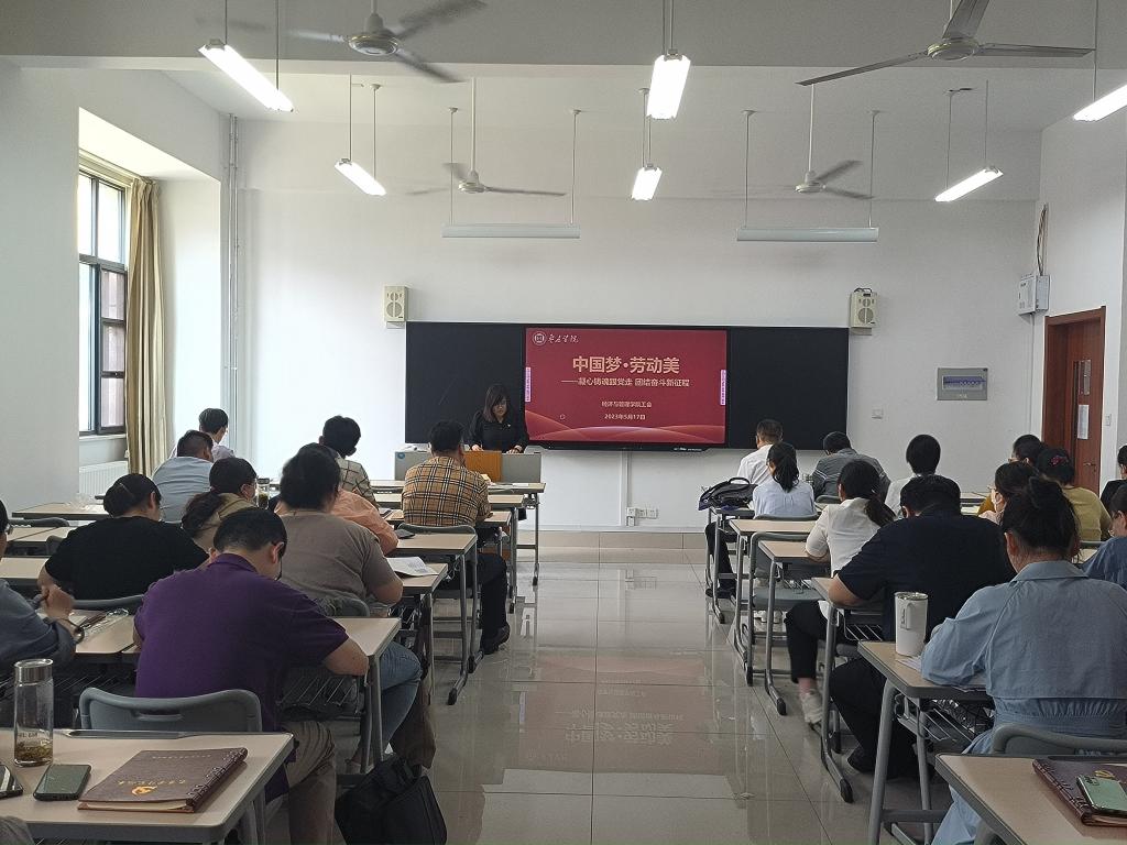 5月17日下午,beat365中文官方网站工会全体教职工会议,学习贯彻习近平总书记“五一”前夕重要指示精神,引领全院教职工切实把思想行动统一到重要指示精神上来,切实把习近平总书记的关心关怀转化为奋进新征程、建功新时代的强劲动力,奋力推动学院工会工作高质量发展。学院工会主席谢金萍主持会议并讲话,全体教职工参加会议。