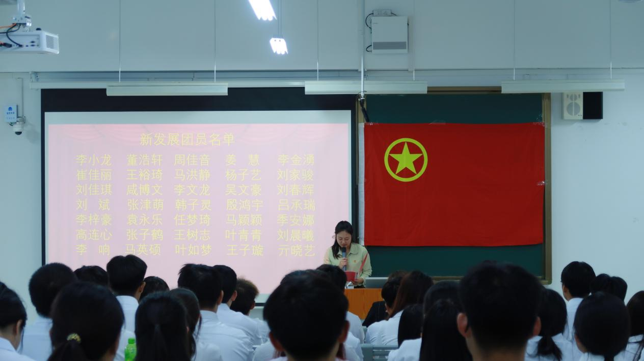 伴随着庄严的国歌和团歌,入团仪式缓缓拉开帷幕。活动伊始,张璇宣读新发展团员名单,团员代表任斯羽介绍团章和团徽并为新发展团员佩戴团徽。随后,团员代表王铭坤带领新发展团员宣誓,要遵守团的章程、服从团的纪律,担起青年责任,不负韶华。稍后,团员代表田长丰和新发展团员代表殷鸿宇分别进行发言,号召大家要积极履行团员义务,不负时光,不负期望。仪式最后,张璇表示,新团员要树立崇高的理想,发挥各自特长,为共青团的发展贡献自己的力量。