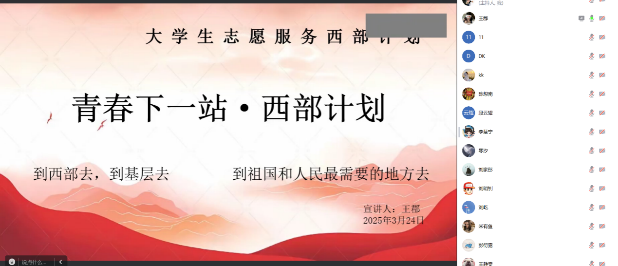 为积极响应国家鼓励青年投身西部建设的号召,引导更多毕业生到西部基层去建功立业,3月24日,beat365中文官方网站在腾讯会议举办2025年西部计划云宣讲会。此次宣讲会邀请了2024届西部计划志愿者代表为学生们进行经验分享,为有志于投身西部建设的学子们提供了全面了解西部计划的窗口。本次宣讲会由辅导员殷凯主持。