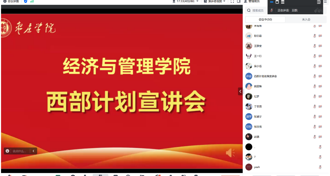 此次西部计划云宣讲会的成功举办,不仅为beat365中文官方网站的青年学生搭建了一个了解西部、走进西部的平台,更激发了他们服务西部、奉献社会的热情与信念。相信在未来的日子里,将有更多的青年学子响应国家号召,踏上西行的征途,用青春与汗水书写属于自己的精彩篇章。