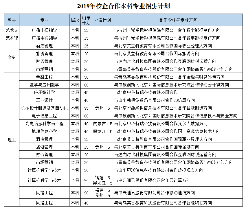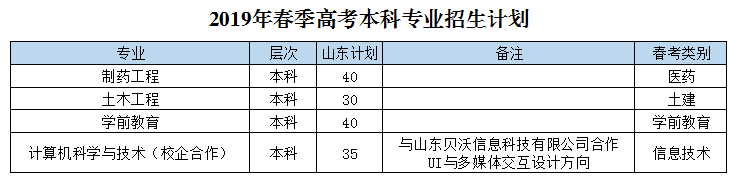2019年我校面向全国25个省(市、自治区)计划招生4640人,其中:本科计划3240人(山东省外计划385人),专科计划1400人。